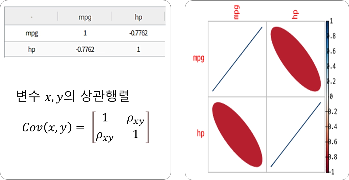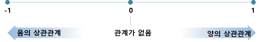 공분산을 이용하여 두 변수의 상관관계를 -1과 1 사이의 값을 갖도록 하는 상관계수