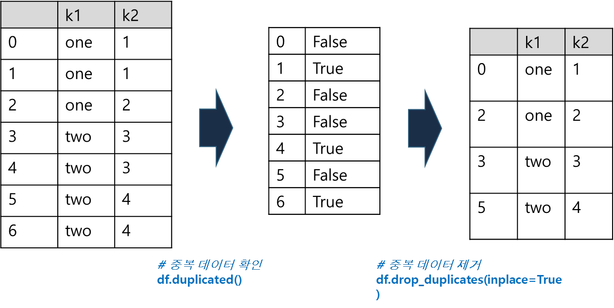 하나의 테이블에 동일한 값이 들어있는 경우, 중복값으로 판단하고 데이터 전처리 과정에서 중복값을 제거하여 사용 하는 것이 일반적임