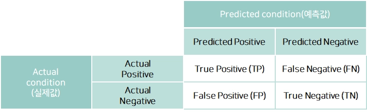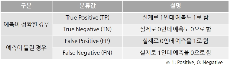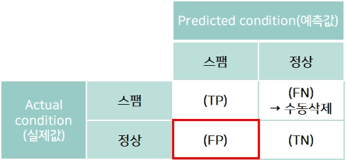 예: 스팸메일 필터링 모델(스팸: Positive, 정상: Negative)