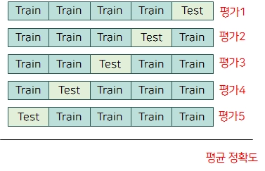 일반화 성능을 측정하기 위해 훈련/테스트 데이터를 여러 번 반복해서 나누고 여러 모델을 학습시키는 통계적 평가방법