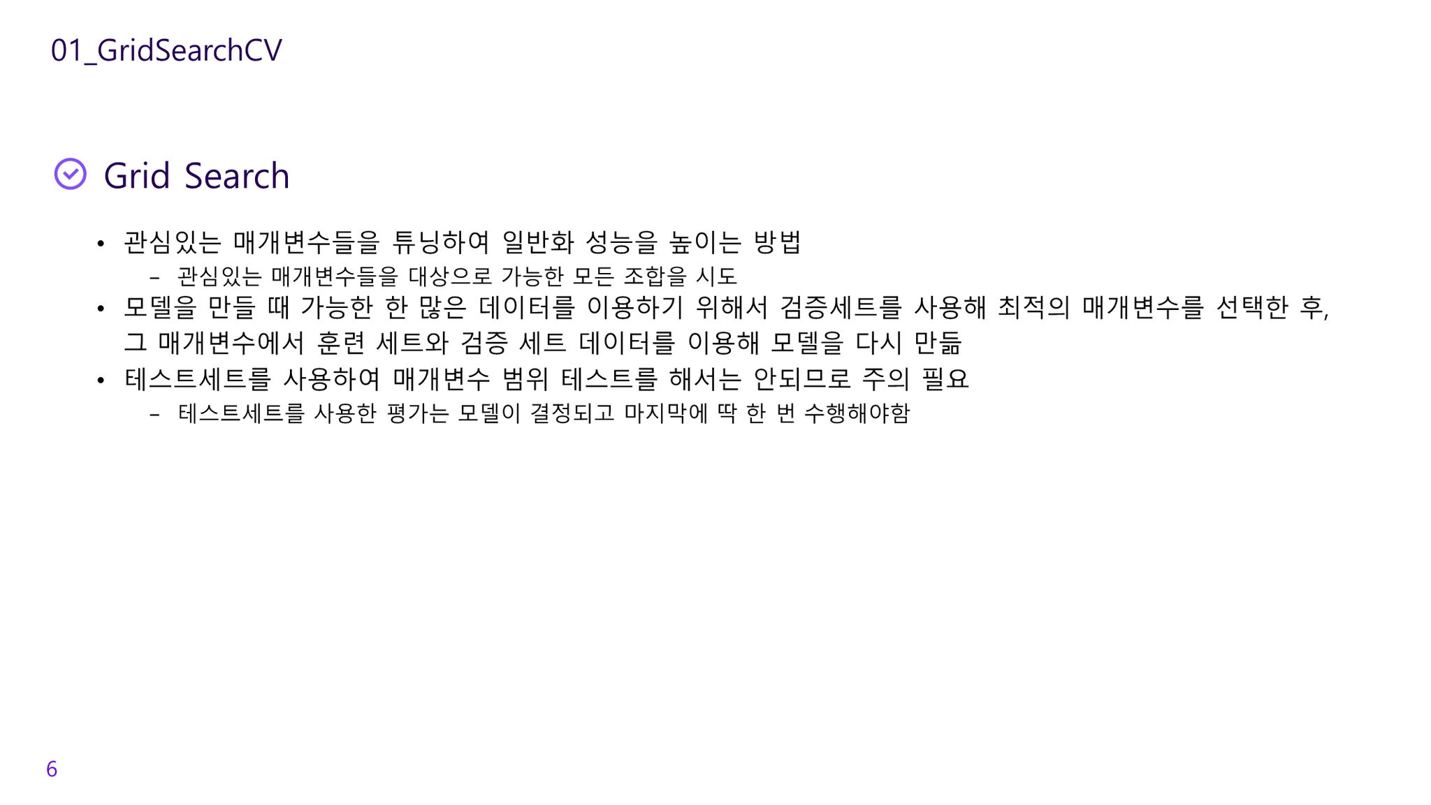 관심있는 매개변수들을 대상으로 가능한 모든 조합을 시도하여 매개변수들을 튜닝하여 일반화 성능을 높이는 방법
